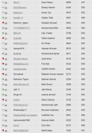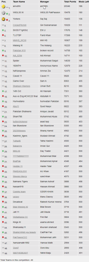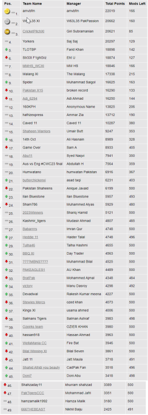 Will not be a good day todaywill definitely end my chances of winning the overall competition. Yeah I have a substantial lead now. You need two or three of your captains to come off with big centuries or 5 wickets. Understandable, and definitely one of the reasons for my lead as on most days I am able to pick before the match. Also probably why someone like MMHC is behind.