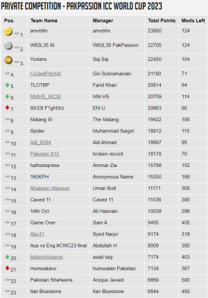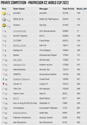 Days Left After amvbfm W63L35 Diff Saj Saj Diff 1 Final 2 Semi-Final 2 3 Semi-Final 1 4 IND-NETH 5 PAK-ENG 6 SAF-AFG & AUS-BD 7 NZ-SRI 8 ENG-NETH 9 AUS-AFG 10 SRI-BD 11 IND-SAF 12 AUS-ENG & PAK-NZ 23105 22035 1070 21355 1750 13 AFG-NETH 22306 21073 1233 20405 1901 14 IND-SL 22019 20662 1357 20297 1722 15 NZ-SAF 21043 19938 1105 19455 1588 16 PAK-BD 20346 19478 868 19455 891
