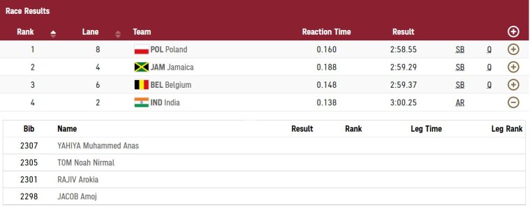 Also nice to see that 4 out of the overall 5 member Indian relay team are Mallus and Tamilians. Funny how each part of India has a culture for specific sports. Punjab and Haryana produce the wrestlers, Northeast India produces the boxers and the weight lifters, Kerala and TN produce the sprinters and long distance runners while Hyderabad gives the badminton shuttlers.